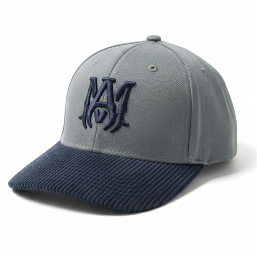 Upgrade your designer streetwear with this Amiri MA Canvas Hat. Featuring a light grey crown with matching eyelets and a dark navy ribbed brim, the cap showcases the iconic “MA” logo embroidered in navy on the front. Crafted from durable cotton canvas, it offers comfort and long-lasting wear. The adjustable strap at the back ensures a secure, customizable fit for most head sizes. Made in the USA, this hat is perfect for casual outfits, urban fashion, and premium everyday style.
