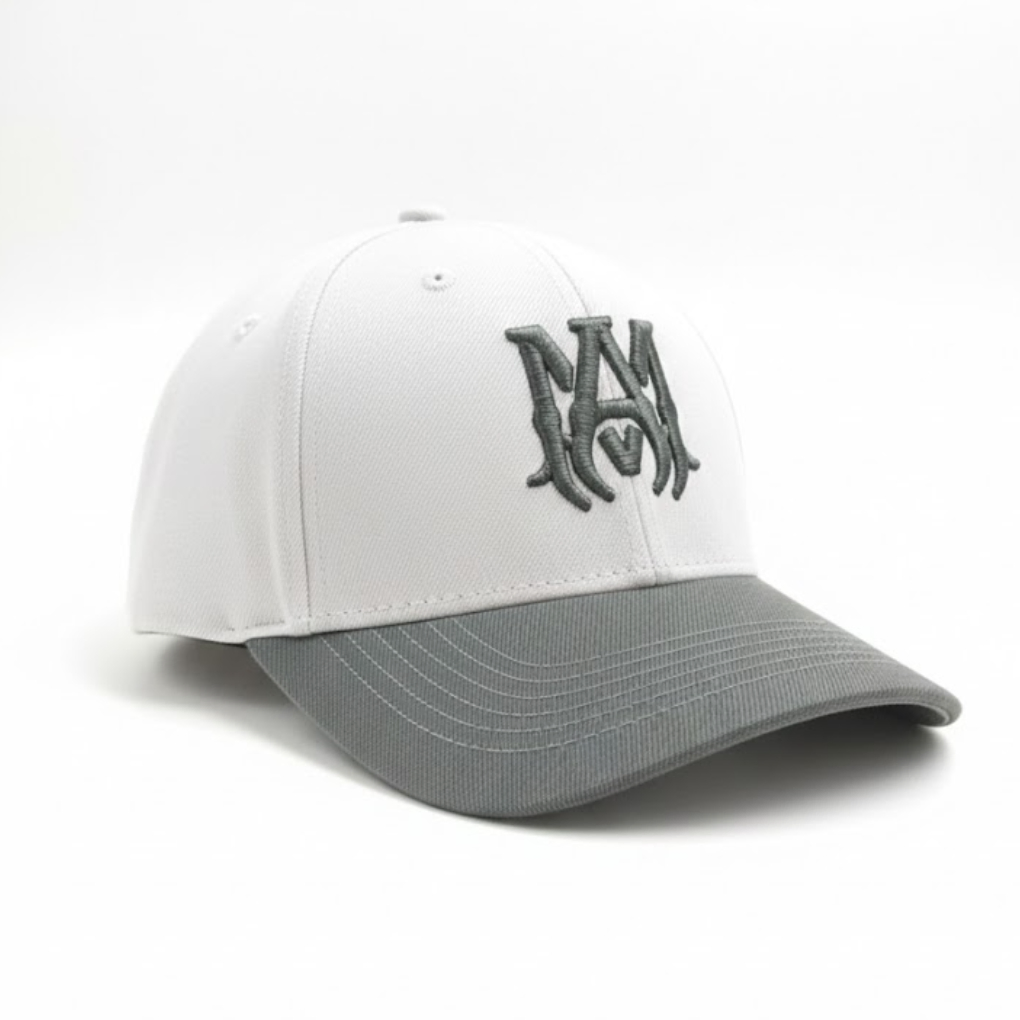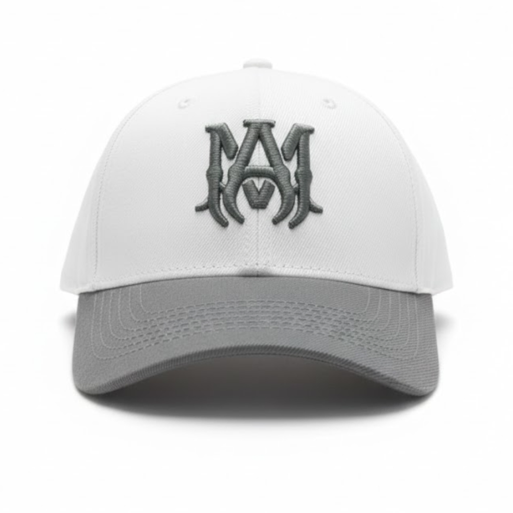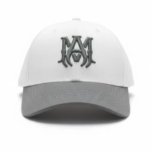 Elevate your streetwear collection with this Amiri MA Logo baseball cap. Featuring a crisp white front panel and a grey curved brim, the cap is highlighted by the signature grey embroidered “MA” logo on the front. Crafted from a premium cotton-polyester blend, this cap offers durability and comfort for everyday wear. The adjustable strap at the back ensures a customizable fit, making it ideal for casual outfits, urban fashion, and premium lifestyle styling. Made with quality craftsmanship, often in the USA, it’s a perfect addition for fans of designer accessories.