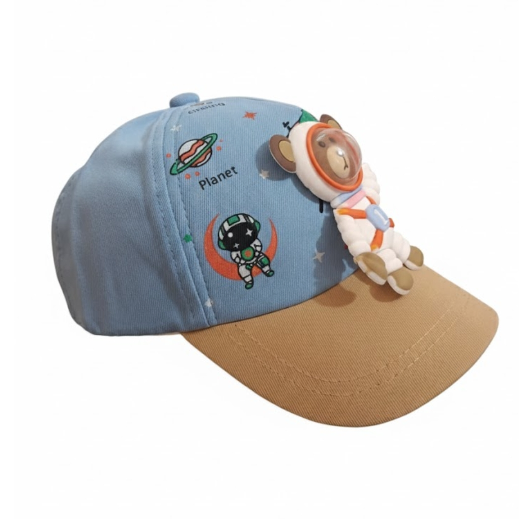 The light blue crown paired with a khaki brim creates a soft, modern look, while colorful space-themed patches like Jupiter and Flyo spark curiosity and fun. Made from a breathable cotton-polyester blend, this cap keeps your child cool and comfy all day.