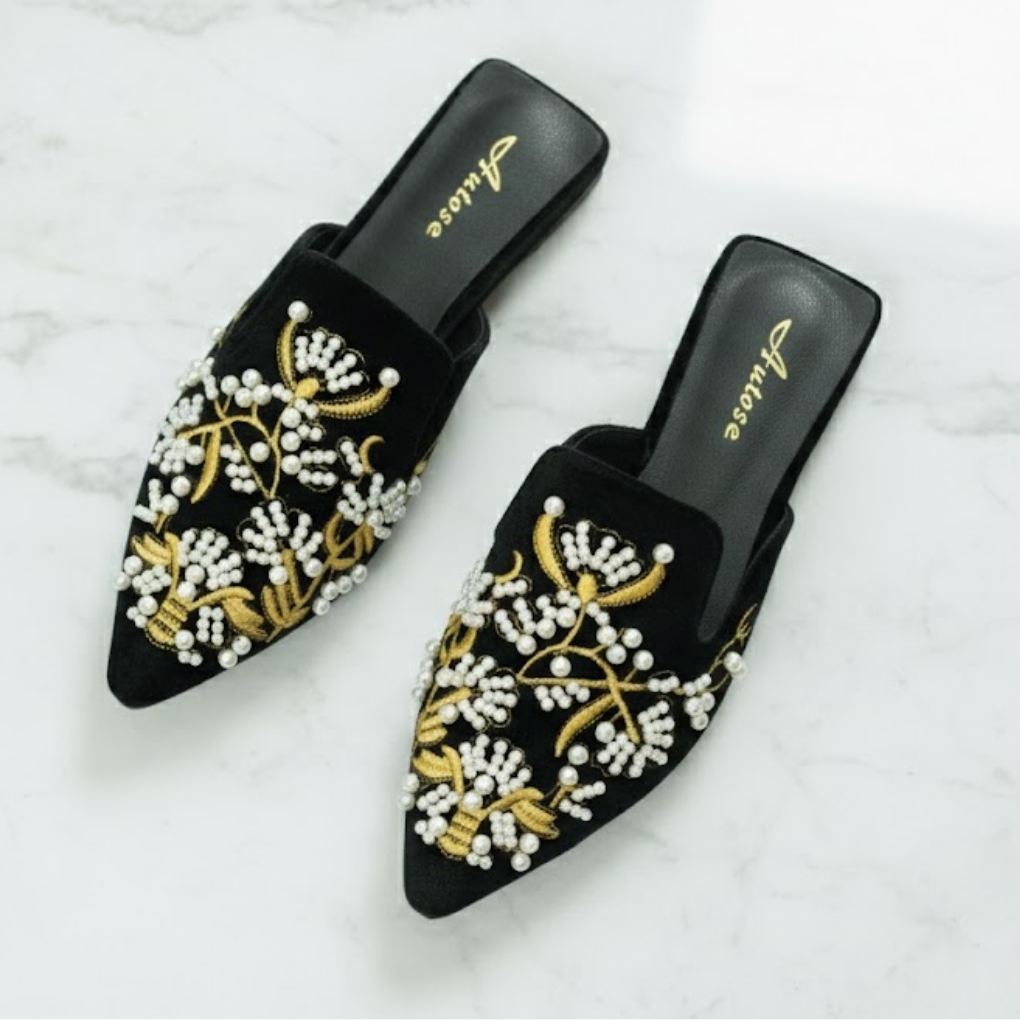 Sophisticated and statement-making, these Autose black pointed-toe flat mules are crafted from soft velvet fabric and adorned with intricate gold thread embroidery. Accented with luminous white and cream pearls, the ornate beadwork creates a refined fusion of traditional artistry and contemporary elegance. The slip-on silhouette ensures effortless wear, while the pointed toe enhances the graceful profile. Ideal for festive celebrations, semi-formal gatherings, and elevated evening styling.