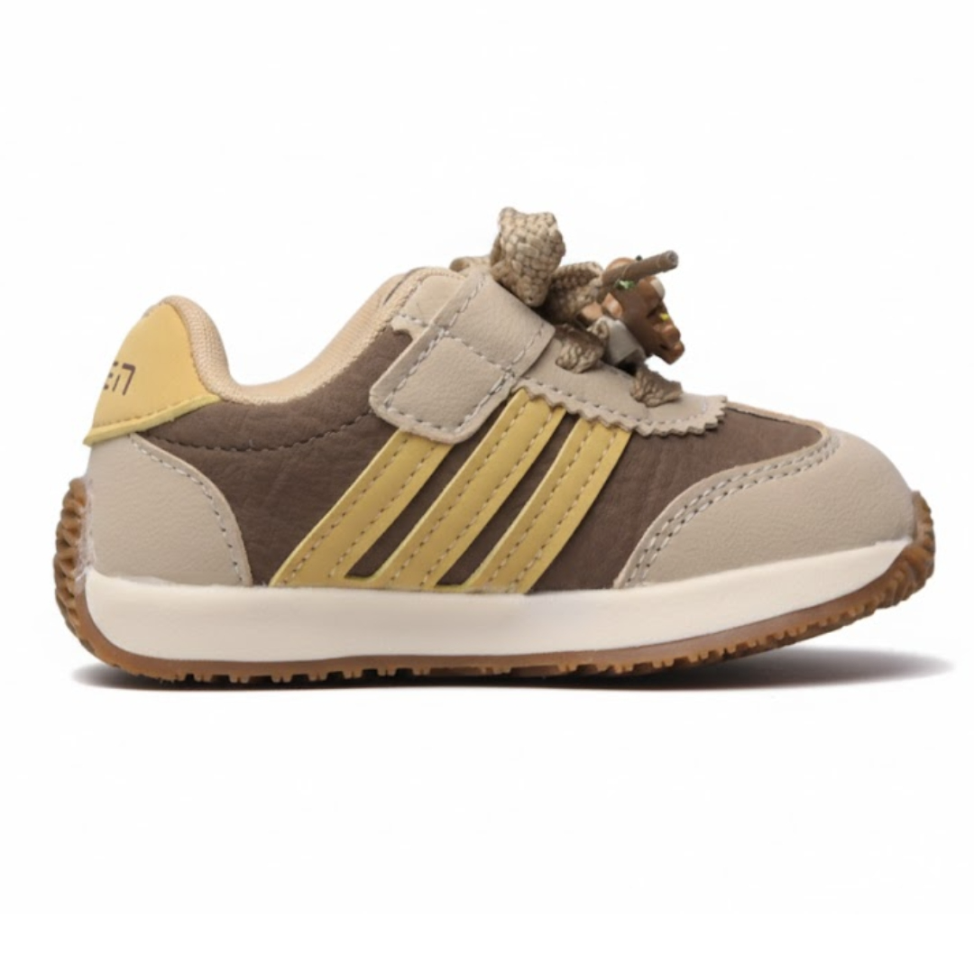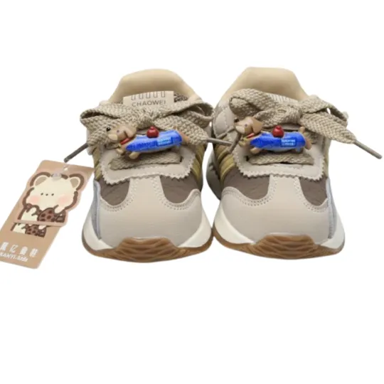 These stylish kids’ shoes combine comfort and playful design. The main body features light beige and dark brown panels, complemented by a creamy white sole for durability and support. Light beige laces with subtle blue and red accents add a fun, colorful touch, making them perfect for everyday wear or casual outings. These shoes are imported and crafted with premium materials for lasting comfort.