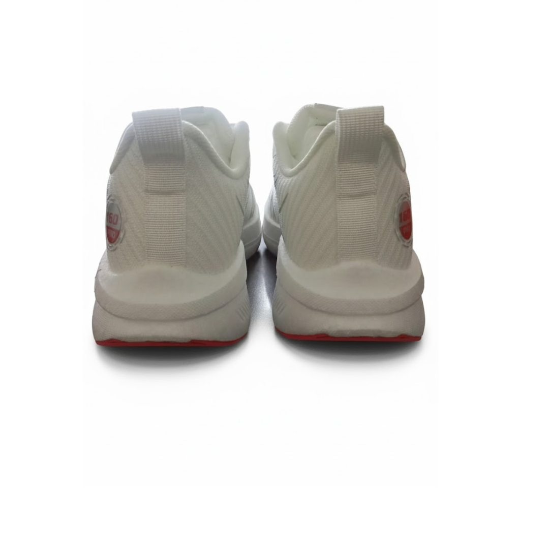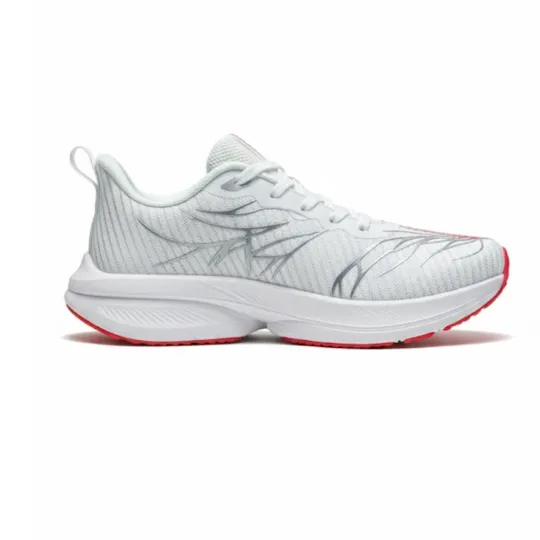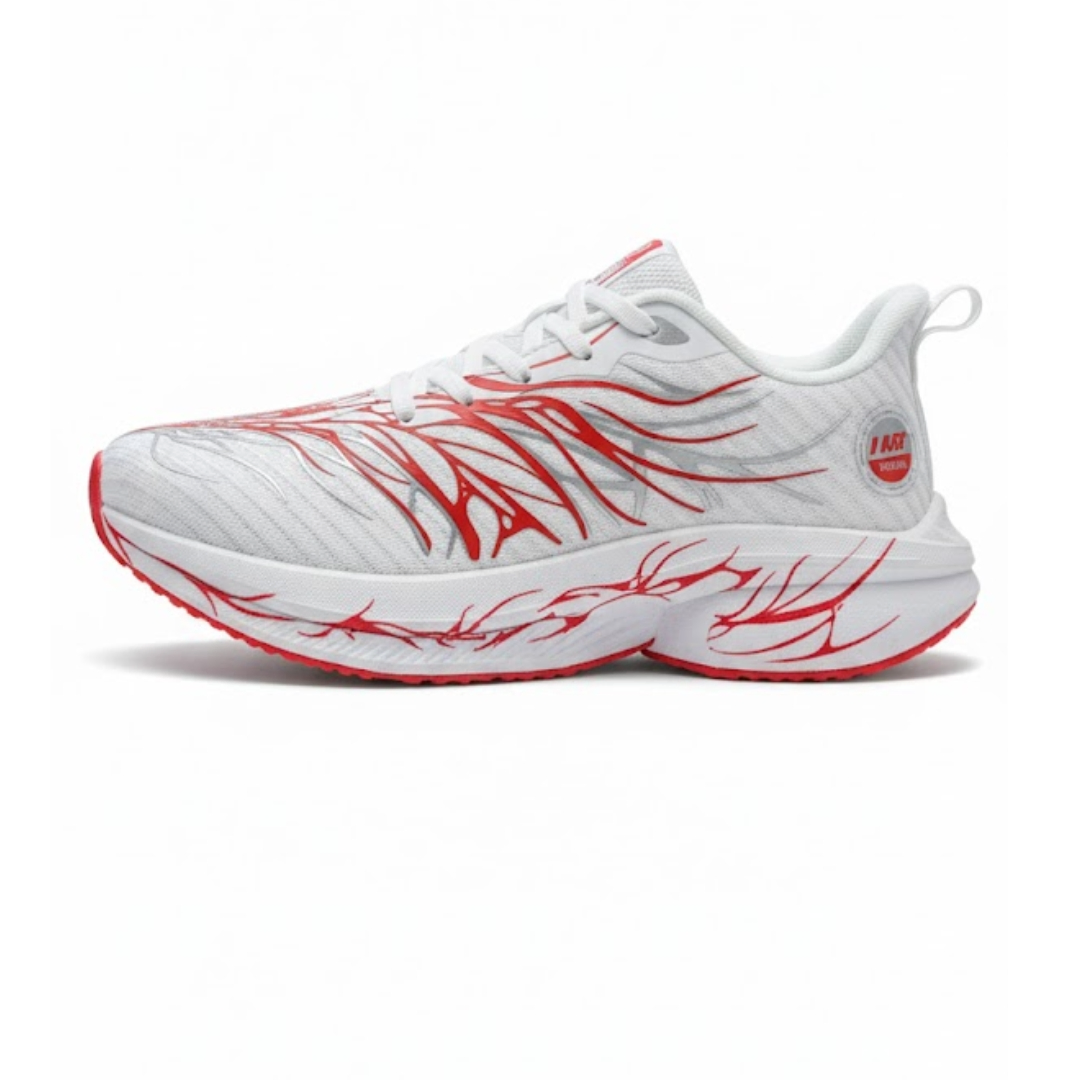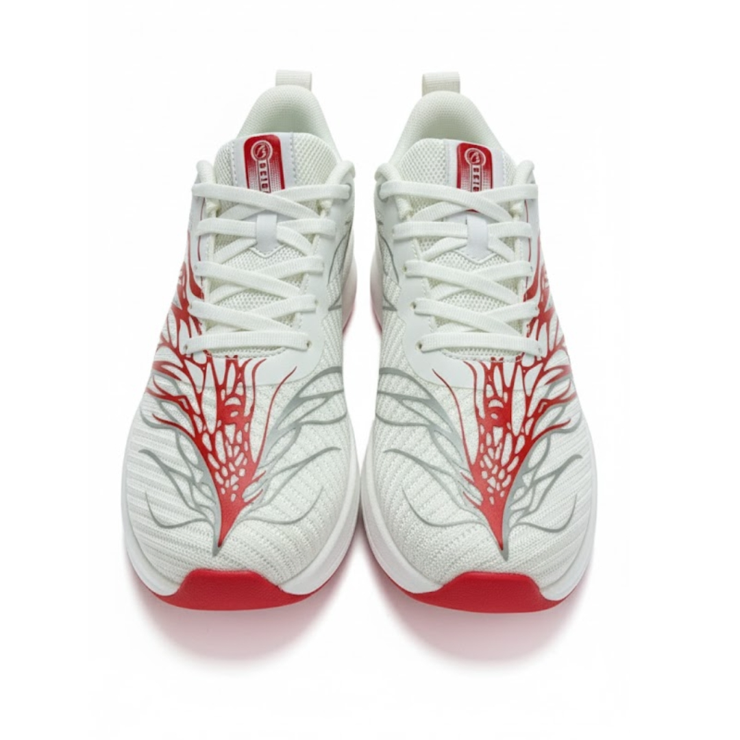 They feature a Papyrus White base with Fluorescent Bright Red and Silver detailing — creating a dynamic, sporty look. The vibrant red appears in a stylized branching pattern along the sides and outsole.