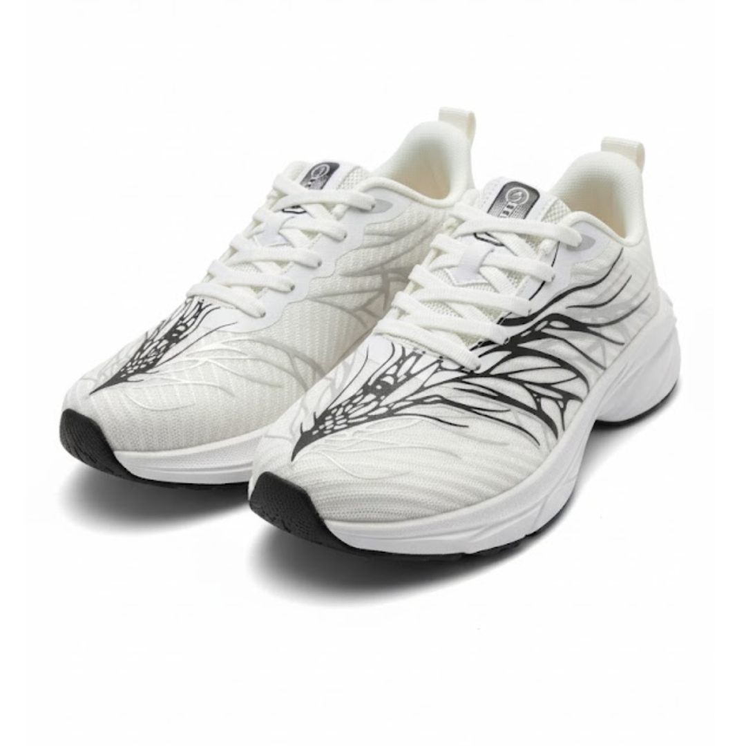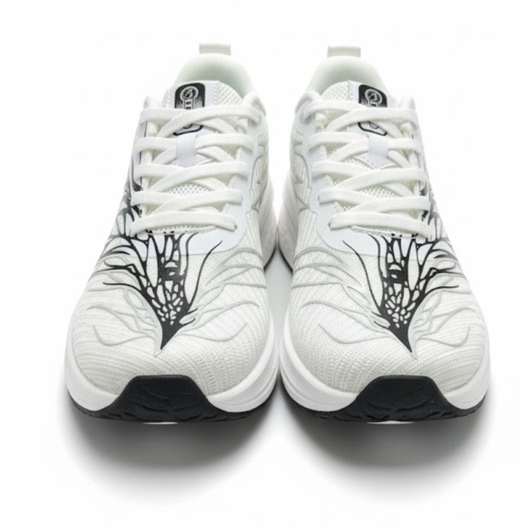The shoes in the image are a pair of white running shoes featuring a black and grey branch-like pattern across the upper. The brand appears to be “Beige”, known for its minimalist yet stylish athletic designs. Lightweight and breathable, these shoes are ideal for casual wear, gym workouts, or daily runs — offering both comfort and a clean, modern look.