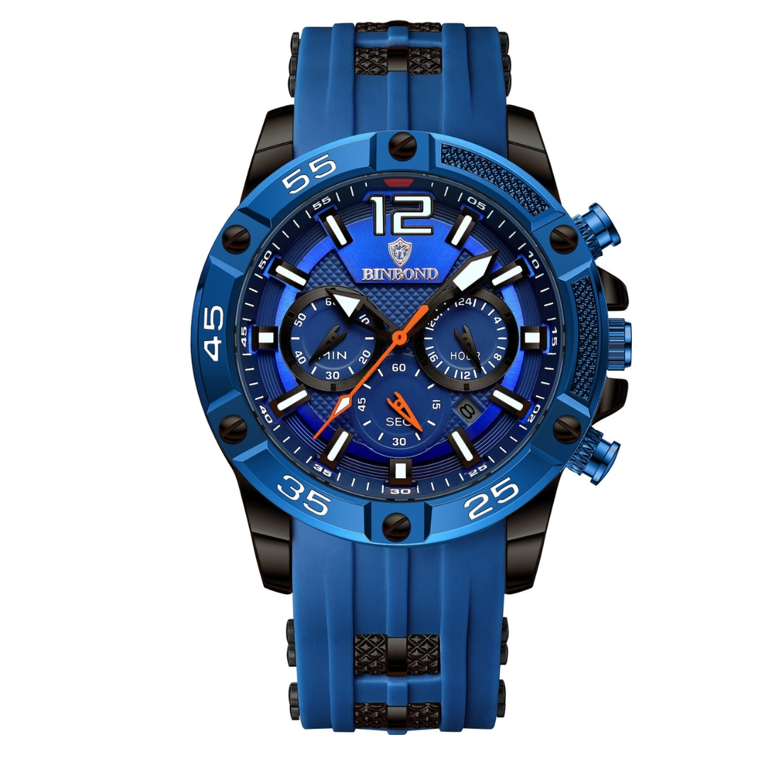 Upgrade your everyday style with the Binbond Men’s Chronograph Watch in a sleek blue colorway. This sport-inspired timepiece features a blue dial, matching bezel, and a durable blue strap with black accents, creating a bold and stylish look. The luminous display ensures easy readability in any light, while the chronograph functionality offers precise timekeeping. Built with a reliable quartz movement and water resistance up to 30 meters, this watch is perfect for active lifestyles and casual wear. Choose comfort, durability, and style all in one with Binbond.