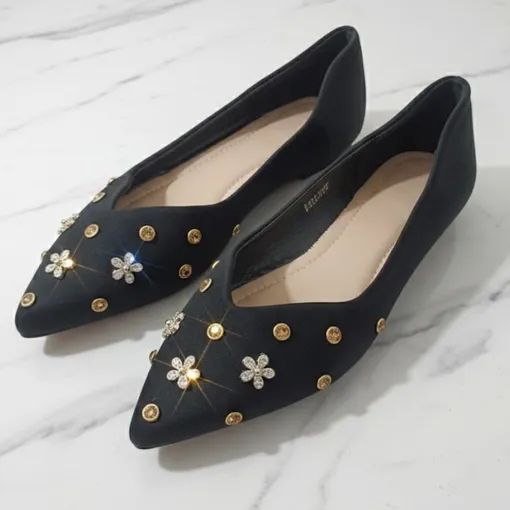 Bold yet timeless, these black pointed-toe ballet flats are designed to make a refined statement. Featuring luxurious gold-toned studs and clear rhinestone embellishments arranged in elegant floral and circular patterns, this slip-on silhouette blends sophistication with modern edge. Crafted with a premium leather-inspired upper, soft inner lining, and cushioned sole for all-day comfort. Perfect for office wear, evening gatherings, formal events, or elevated everyday styling.