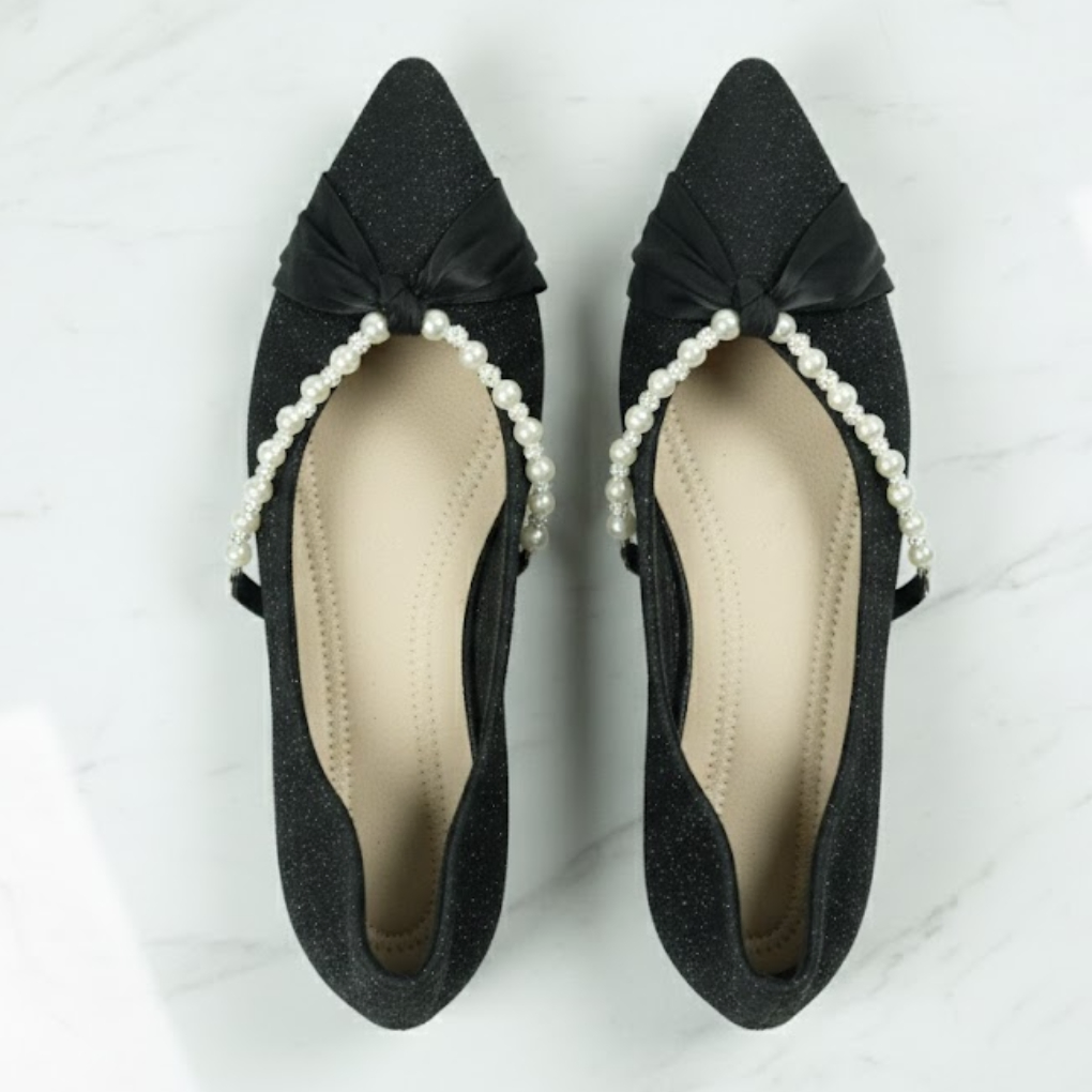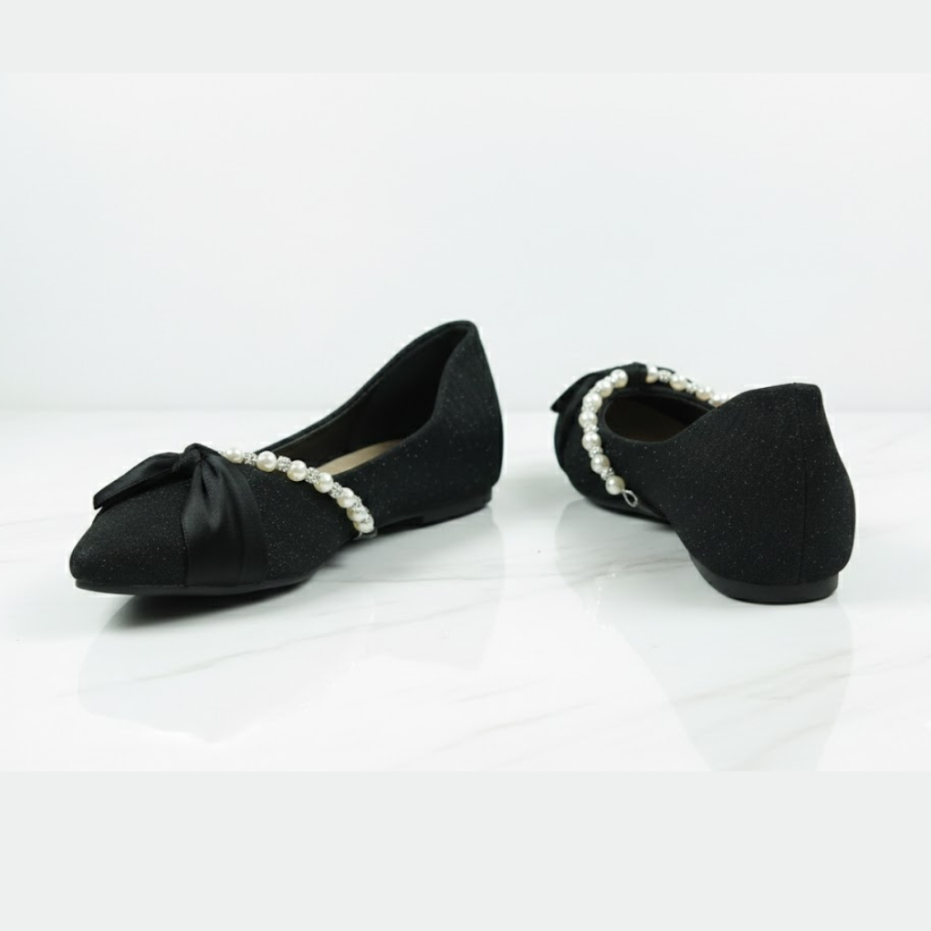 Timeless elegance meets modern femininity in these black pointed-toe ballet flats. Designed with a sleek silhouette, the upper is beautifully adorned with a delicate strand of white pearls and a refined ribbon bow accent. Crafted from premium satin or fine synthetic leather with a soft inner lining and non-slip rubber outsole, these flats ensure all-day comfort with graceful sophistication. Perfect for weddings, office wear, formal gatherings, or elevated everyday styling.