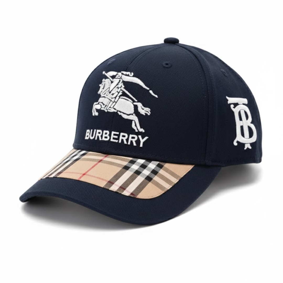 Elevate your look with timeless British luxury through the Burberry Vintage Check Baseball Cap. This sophisticated piece combines modern design with iconic heritage — featuring a navy blue crown and a brim adorned in Burberry’s signature Vintage Check pattern in beige, black, red, and white. The front showcases a white embroidered Burberry Equestrian Knight logo, while the side features the elegant “TB” monogram, honoring founder Thomas Burberry. Expertly crafted in Italy from premium cotton gabardine, this cap offers a structured fit, breathable comfort, and unmistakable brand prestige.