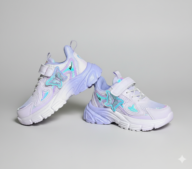 Let your little one step out in style with the Butterfly Glow Kids’ Sneakers. Designed in a dreamy mix of purple and blue, these sneakers feature playful butterfly and heart details that kids will love. With a lightweight sole, breathable mesh, and Velcro + lace closure, they provide comfort, durability, and a secure fit for all-day adventures.