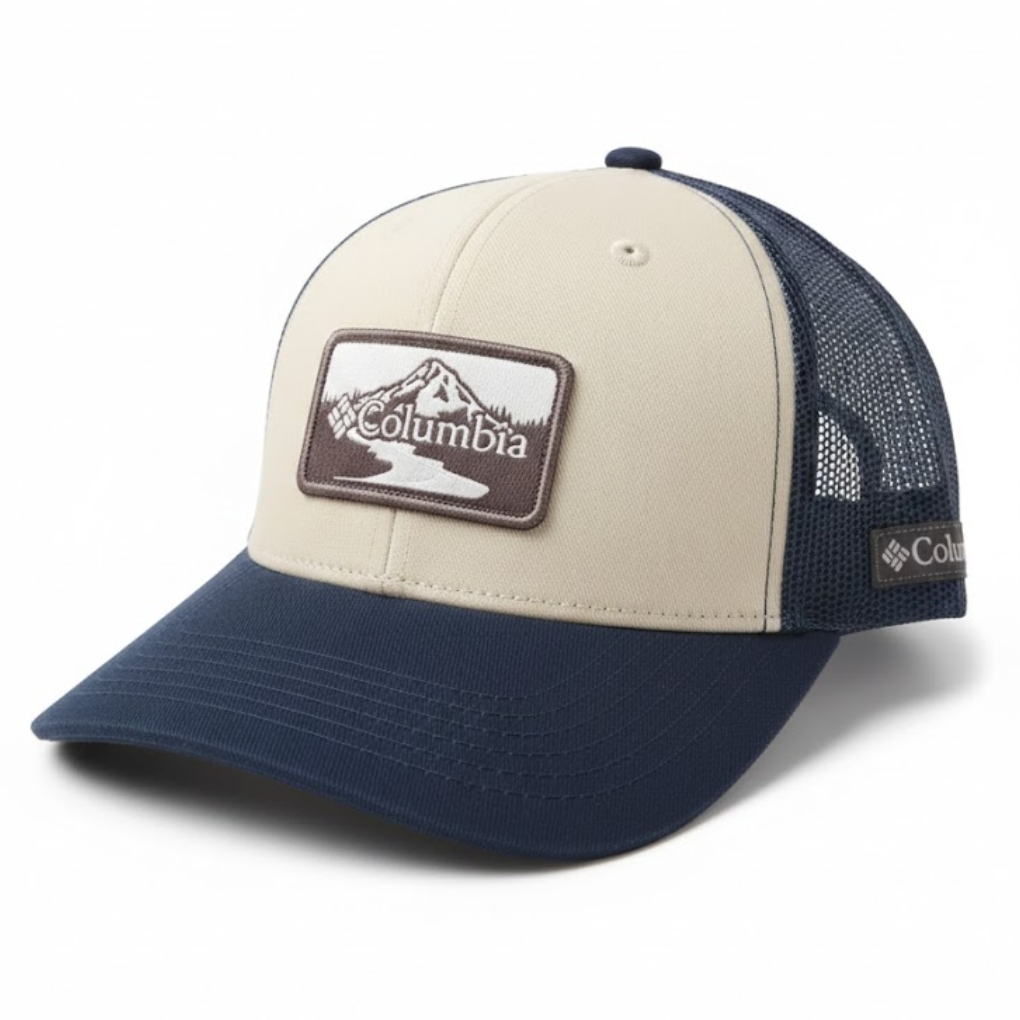 Embrace outdoor elegance with the Columbia Mesh Trucker Cap – Mountain Sunset Navy/Tan. Featuring navy blue front panels and a matching pre-curved brim with tonal stitching, paired with a tan mesh back for optimal ventilation, this six-panel structured cap balances performance and style. The shield-shaped embroidered patch captures a serene mountain silhouette against a sunset in shades of orange, yellow, and light blue, while a subtle Columbia logo tag adds a signature touch. One-size-fits-most with adjustable snapback ensures a perfect fit for every adventure.