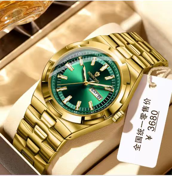 The BINBOND B860 Gold Watch with Green Dial brings a premium, standout look to your everyday style. Designed with a gold-toned stainless steel band and gold case, this model features a rich green dial that adds a bold and elegant contrast.