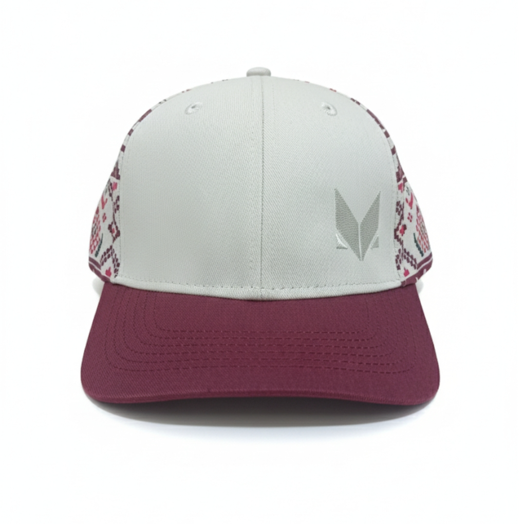 Elevate your casual look with this stylish Grey & Maroon Baseball Cap. Featuring a sleek grey crown with a subtle logo print, a deep maroon brim, and patterned side panels, this cap blends modern minimalism with a unique cultural touch. Made from durable fabric, it comes with an adjustable strap at the back for a comfortable, free-size fit—perfect for all-day wear.