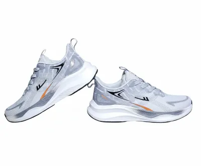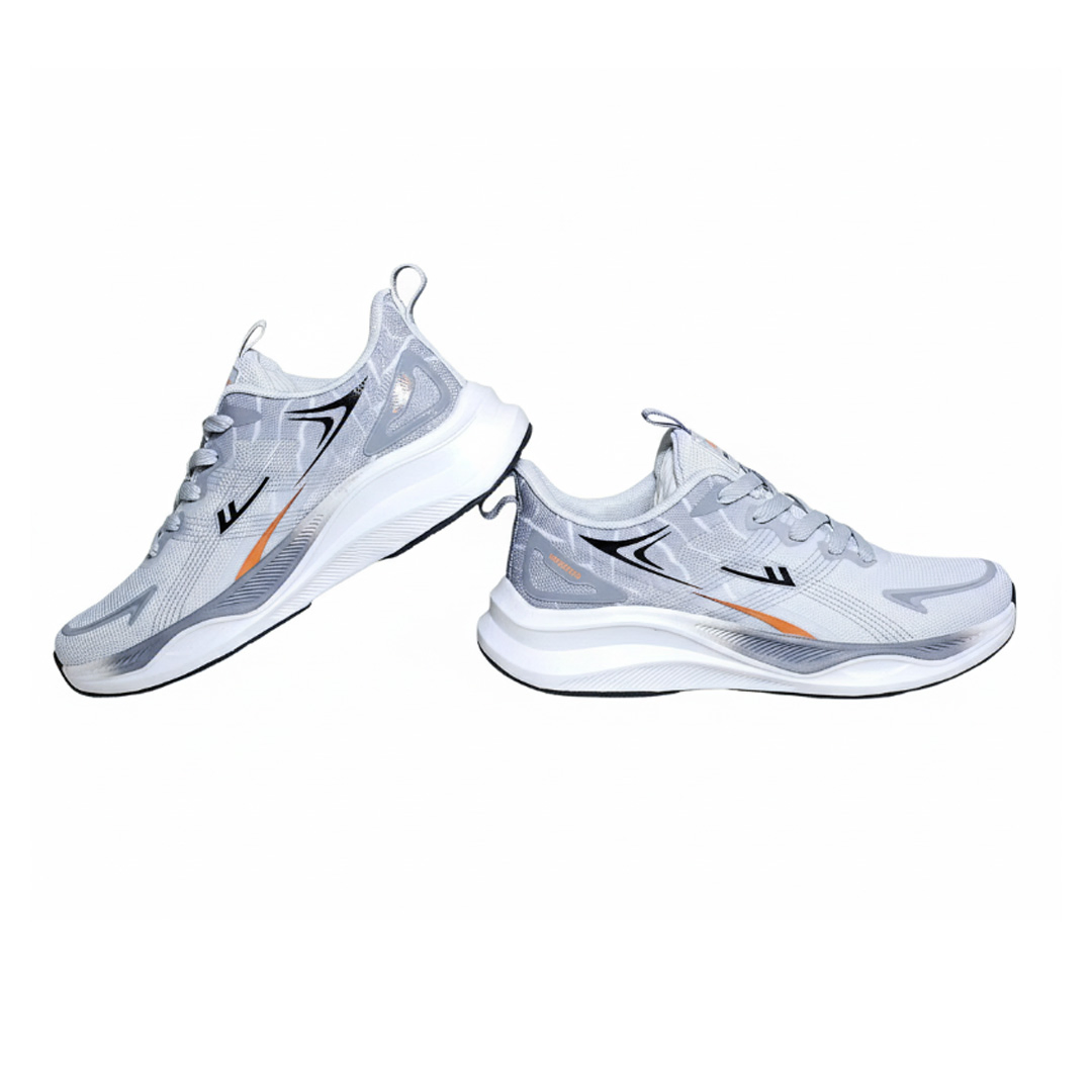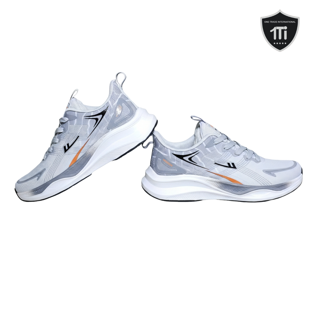 Unleash your potential with the Ignite Velocity Trainers. These premium, imported shoes are designed for dynamic performance and sleek style. The light gray upper features a textured pattern and is accented with sharp, modern black and a pop of vibrant orange, giving them an energetic look. Built with a lightweight, breathable mesh, these trainers provide a comfortable, secure fit. The sculpted, cushioned sole is engineered for superior support and responsive energy return, making every stride feel effortless. Whether you're at the gym, on a run, or just on the go, the Ignite Velocity Trainers deliver an exclusive blend of high-performance function and bold design.