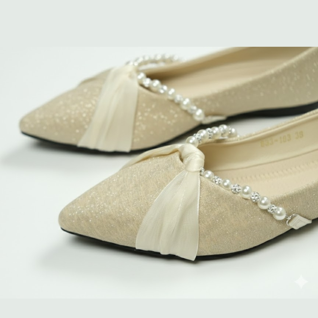 Gracefully refined, the Liora pointed-toe flats in elegant beige feature a delicate pearl strand and feminine bow embellishment across the vamp. Crafted with a smooth PU upper and lining, paired with a durable rubber sole, these flats deliver both comfort and polished sophistication. The subtle 2.5 cm heel provides gentle elevation, making them perfect for office wear, weddings, formal gatherings, or elevated everyday styling. Also available in classic black.