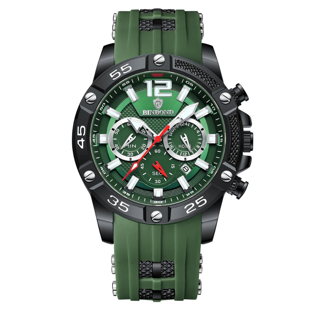Stand out with the Binbond B9798 Men’s Chronograph Watch, a perfect blend of sporty design and reliable functionality. Featuring a striking green dial with luminous hands for easy readability, this watch comes with a durable black case and a comfortable green silicone rubber strap. The chronograph functionality allows precise time measurement, while the calendar date display keeps you on schedule. Powered by quartz movement and designed for everyday wear, this stylish watch is ideal for men who value performance and modern aesthetics.