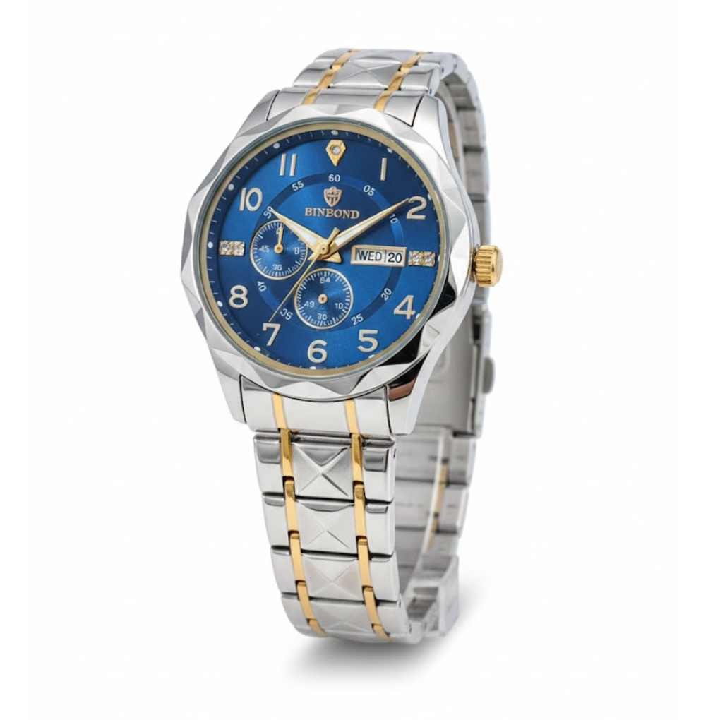 Refined and versatile, the BINBOND Men’s Quartz Watch blends business elegance with everyday comfort. Featuring a striking blue dial with luminous hands and dual calendar (date & week) display, this watch ensures clear readability day or night. The premium two-tone stainless steel bracelet in silver and gold adds a polished, executive look, while the precise quartz movement delivers reliable timekeeping. Built with a durable alloy or stainless steel case, scratch-resistant Hardlex crystal, and 3ATM water resistance, this timepiece is perfect for professionals who want luxury style with practical performance.