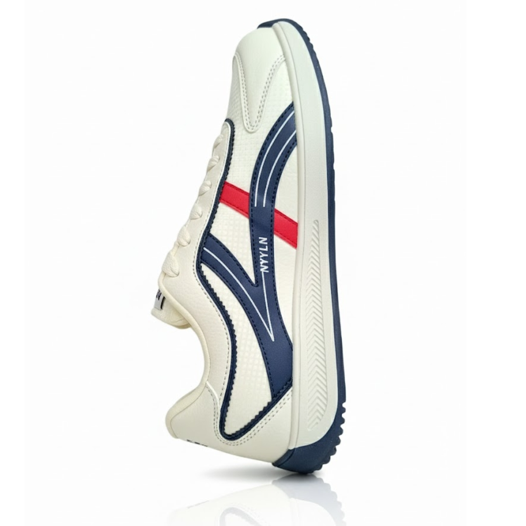 Upgrade your everyday footwear with the NYLION Retro Sport Sneakers, designed to blend timeless style with modern comfort. Featuring a breathable mesh upper reinforced with durable synthetic leather overlays, these imported sneakers offer long-lasting wear and reliable support. The lightweight cushioned sole ensures all-day comfort, while the navy and red accent stripes add a sharp, sporty finish. Perfect for casual outings, daily use, and light activity.