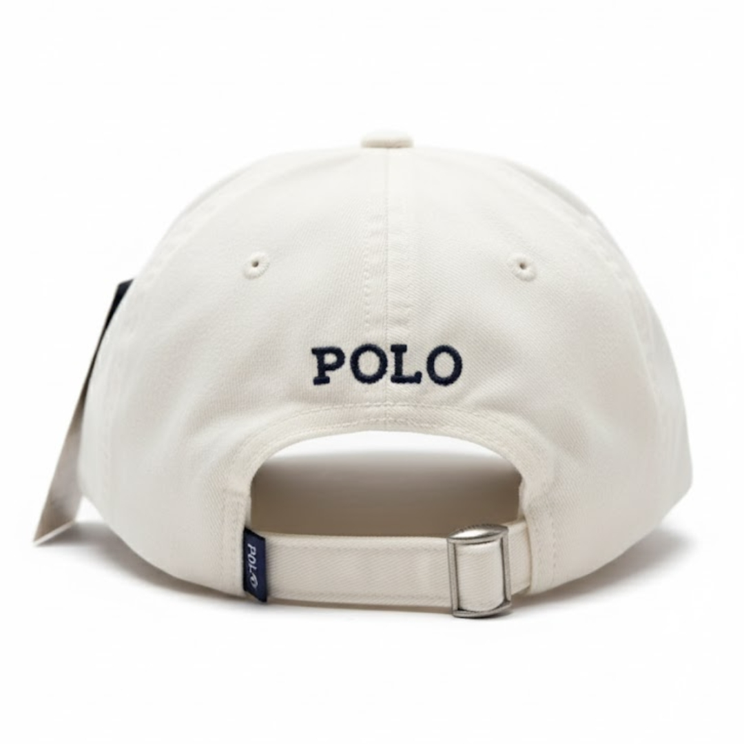 Featuring the iconic embroidered Polo Pony logo in deep navy blue on the front, it reflects the perfect blend of heritage style and modern simplicity. Designed with a pre-curved brim, six-panel construction, and an adjustable strap closure, it ensures all-day comfort and a personalized fit. Whether paired with a casual tee or a crisp polo shirt, this white cap adds a touch of effortless Polo elegance to any outfit.