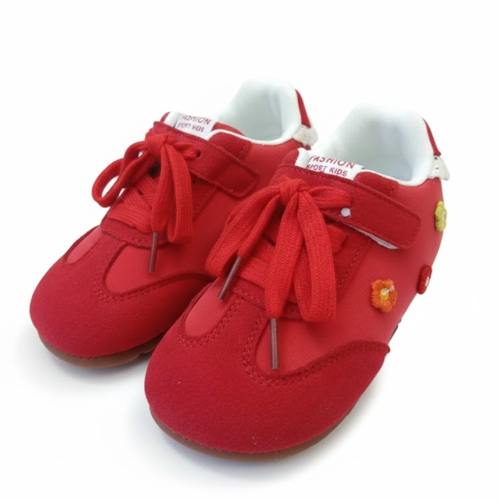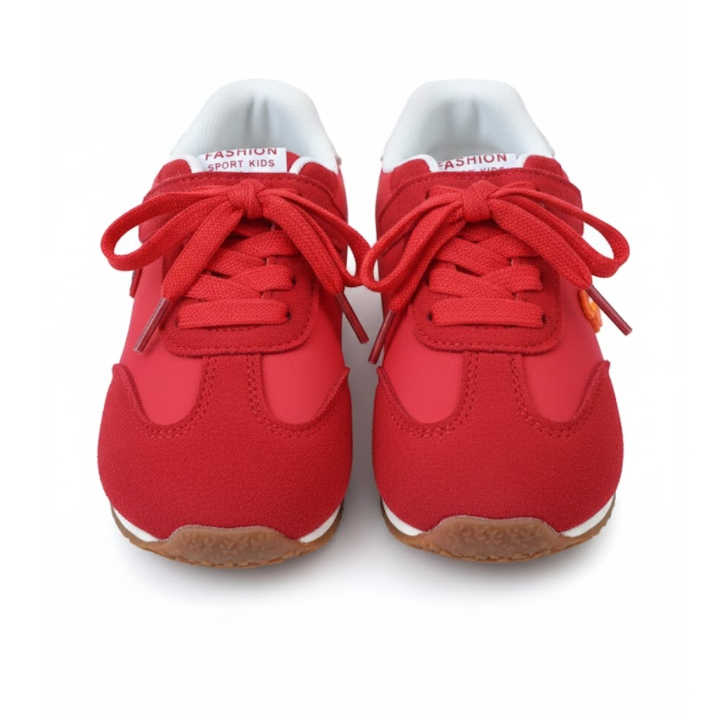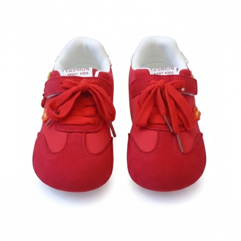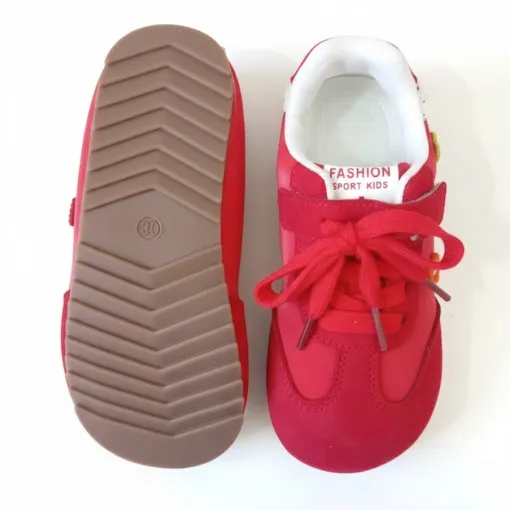 These red girls’ sneakers from Fashion Sport Kids combine style, comfort, and playful design. Made with a soft suede-like exterior and white fabric lining, they feature red laces and a Velcro strap for easy wear.