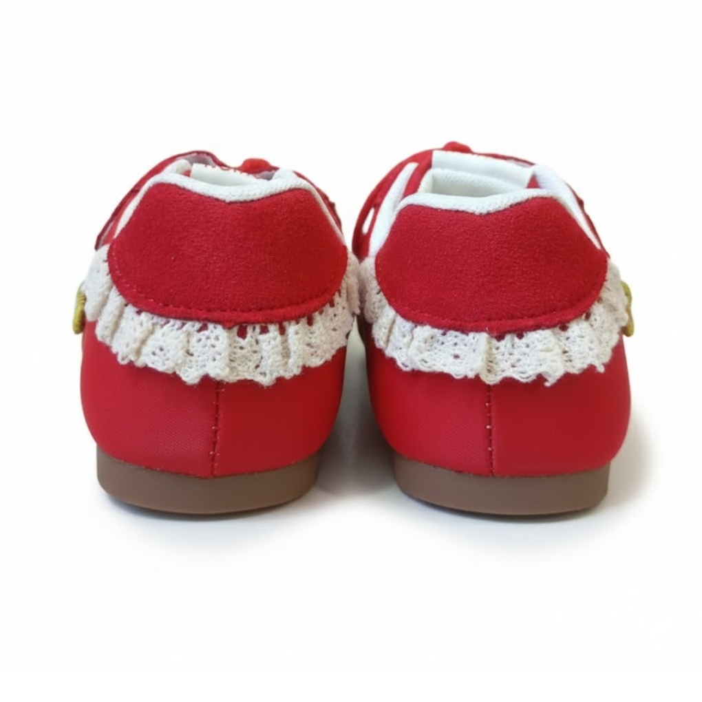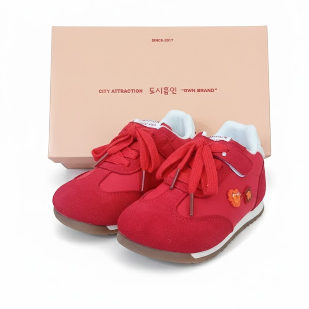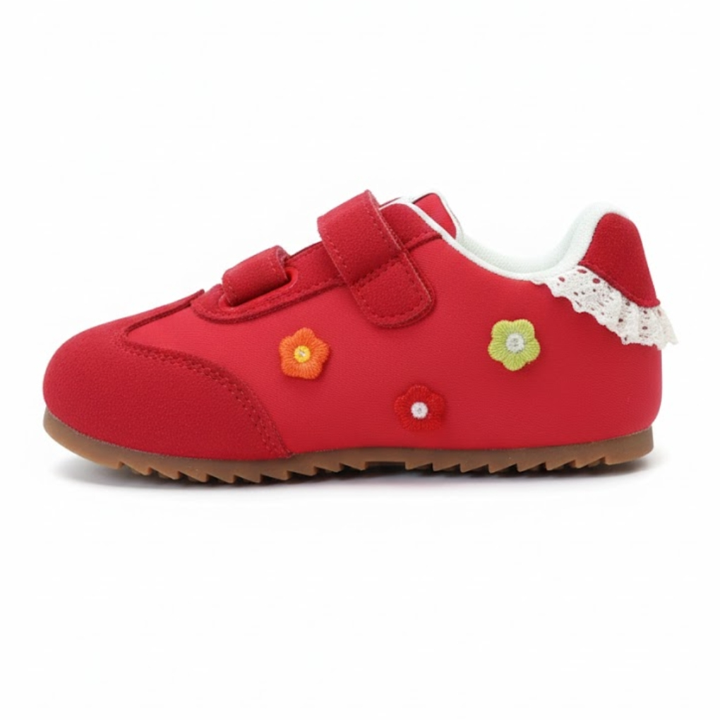 These red girls’ sneakers from Fashion Sport Kids combine style, comfort, and playful design. Made with a soft suede-like exterior and white fabric lining, they feature red laces and a Velcro strap for easy wear.