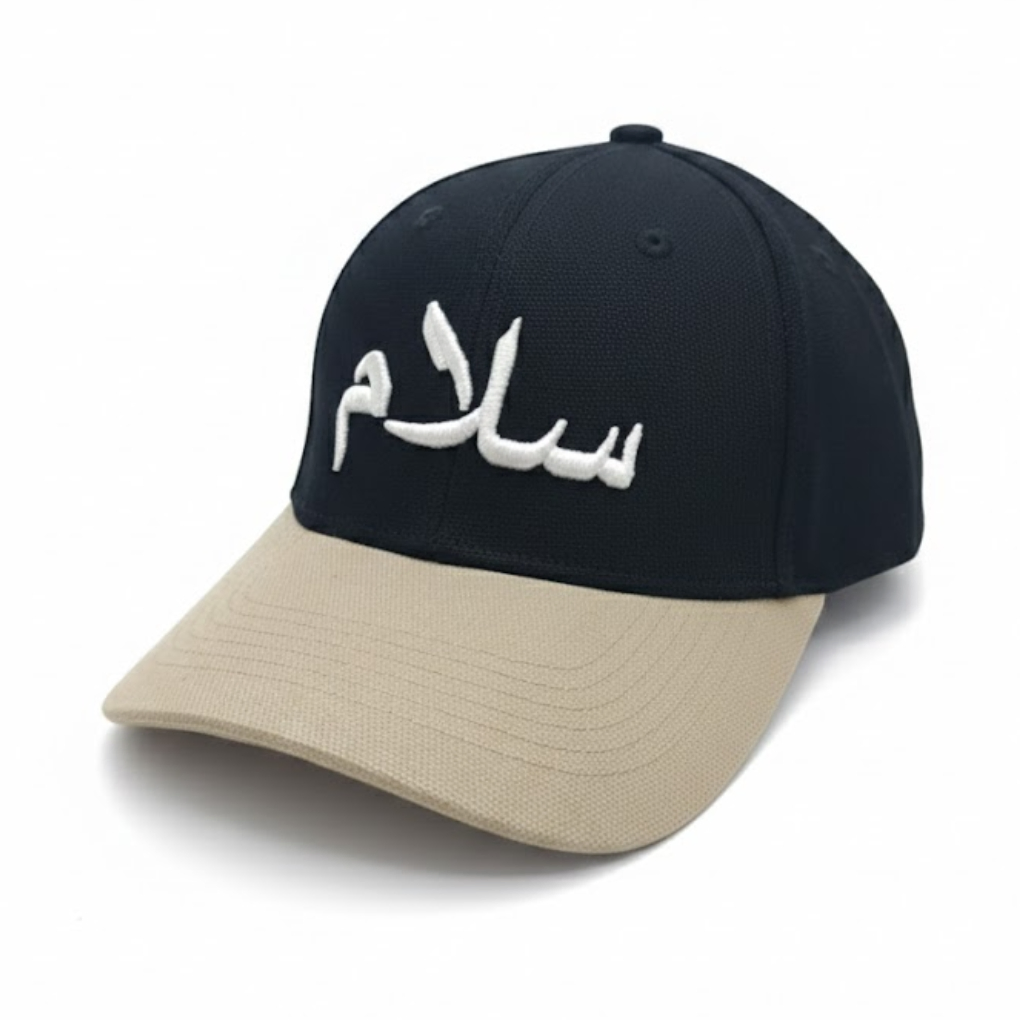 Celebrate peace and style with this “Salam (سلام)” adjustable baseball cap. Featuring a navy blue crown paired with a khaki beige bill, the cap showcases crisp white Arabic embroidery on the front, delivering a clean and meaningful design. Made from high-quality cotton twill, it ensures durability and comfort for everyday wear. The structured crown and adjustable strap closure provide a customizable fit for most head sizes, while the curved bill completes a classic, casual look. Perfect for daily wear, casual outings, and spiritual expression.