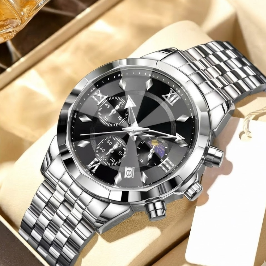 Equipped with chronograph sub-dials, a moon phase indicator, and a date display, it offers both style and functionality. Quartz movement ensures accurate timekeeping, while the coated glass dial protects against scratches. With a 42mm case diameter and 3BAR (30m) water resistance, it is suitable for daily wear, rain, and splashes. The folding clasp with hidden butterfly push-button adds security and a sleek finish.