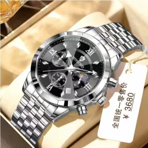 The BINBOND 3653 Silver Men’s Watch combines elegance, precision, and multifunctional design. Featuring a silver stainless steel case and bracelet paired with a black dial, this watch is highlighted by silver-toned hands and Roman numeral markers with luminous technology for easy reading in low-light conditions.