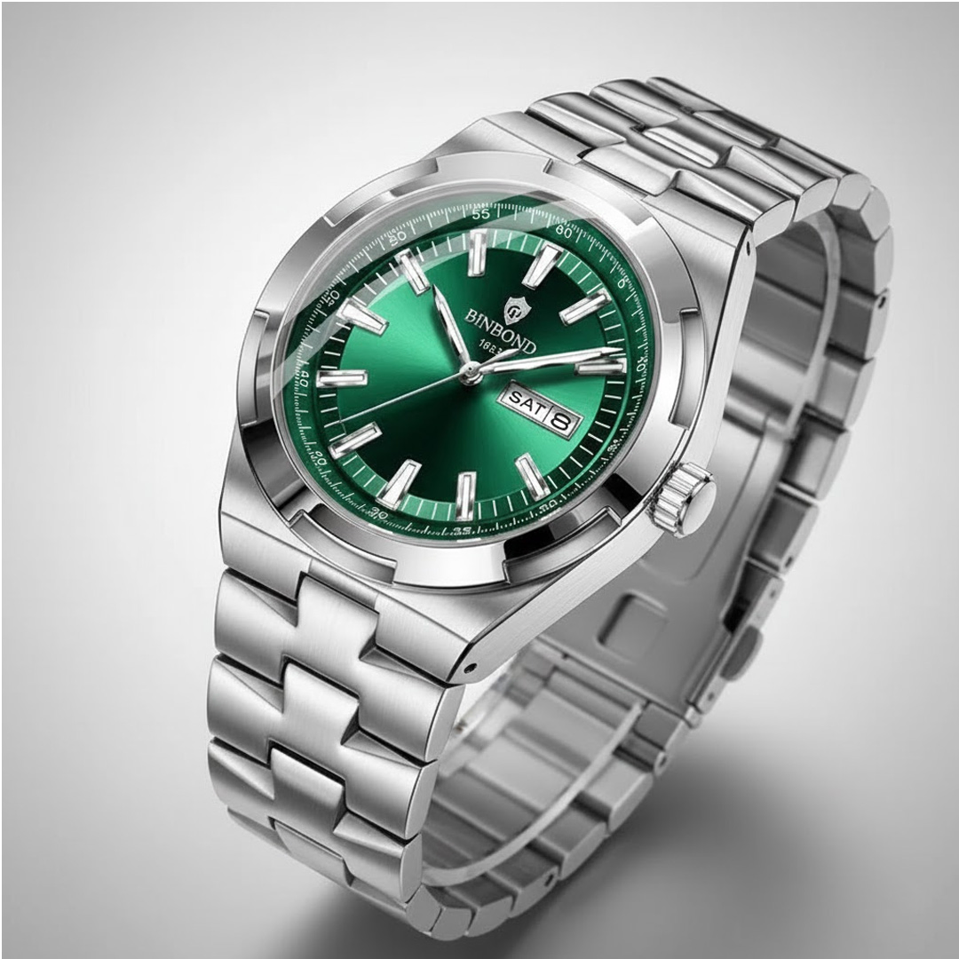 The BINBOND B860 Silver Watch with Green Dial combines modern style with reliable everyday performance. Its vibrant green sunburst dial creates a bold, eye-catching look, perfectly complemented by a silver-toned stainless steel case and bracelet.