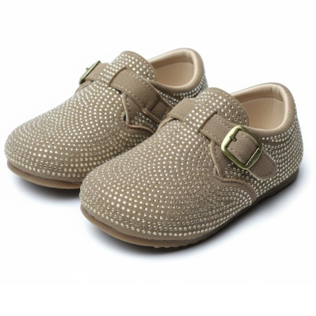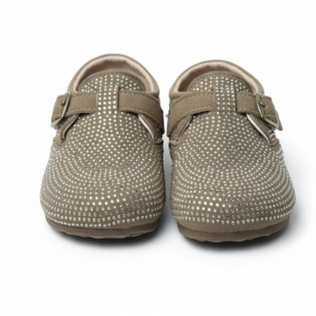 Add a touch of sparkle to tiny steps with Sparkle Fawn Baby Shoes! These light brownish-gray (beige/fawn) shoes are adorned with shiny studs and feature a cute buckle strap for easy wear. Perfect for baby girls, they’re comfortable, stylish, and ideal for special occasions or everyday outings.