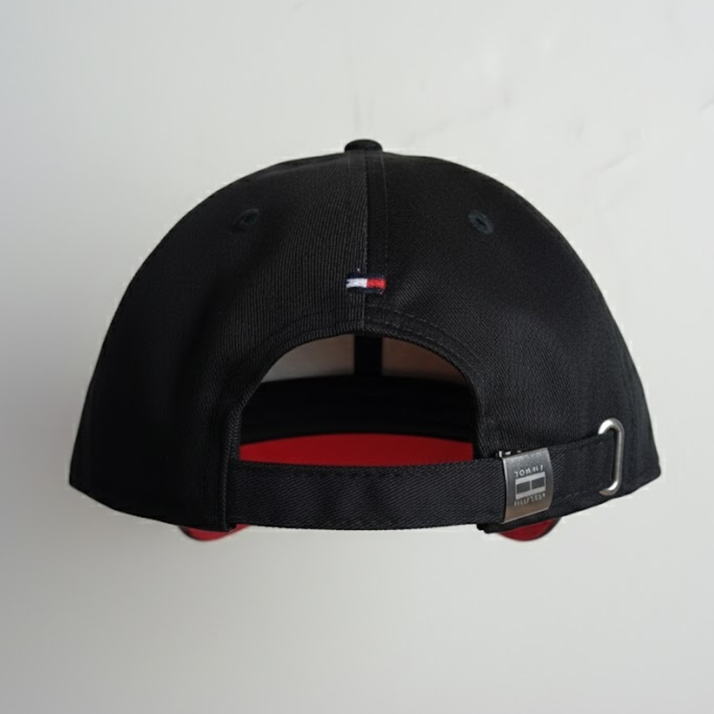 Show off classic American style with the Tommy Hilfiger Skyline Baseball Cap in black with a red brim. Crafted from 100% organic cotton, this 6-panel cap offers comfort, durability, and a premium feel. The front features the Tommy Hilfiger signature and iconic red, white, and blue flag logo, adding a bold, authentic touch. With an adjustable strapback, it provides a secure, one-size-fits-most fit, making it perfect for everyday wear or urban-inspired casual outfits.