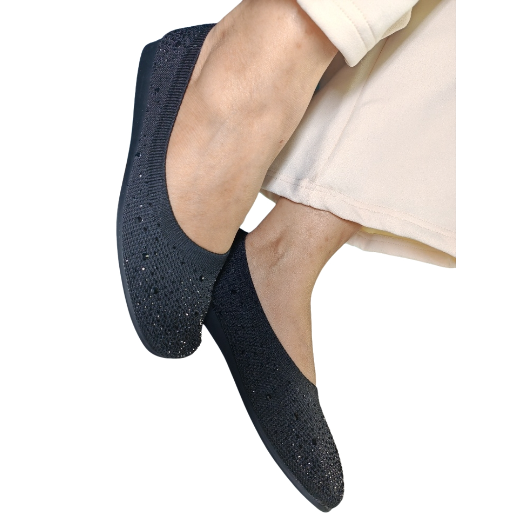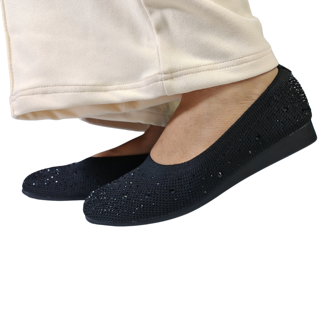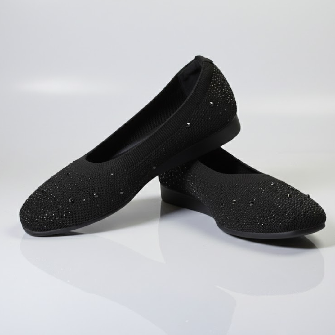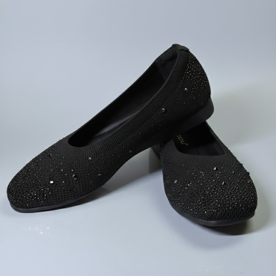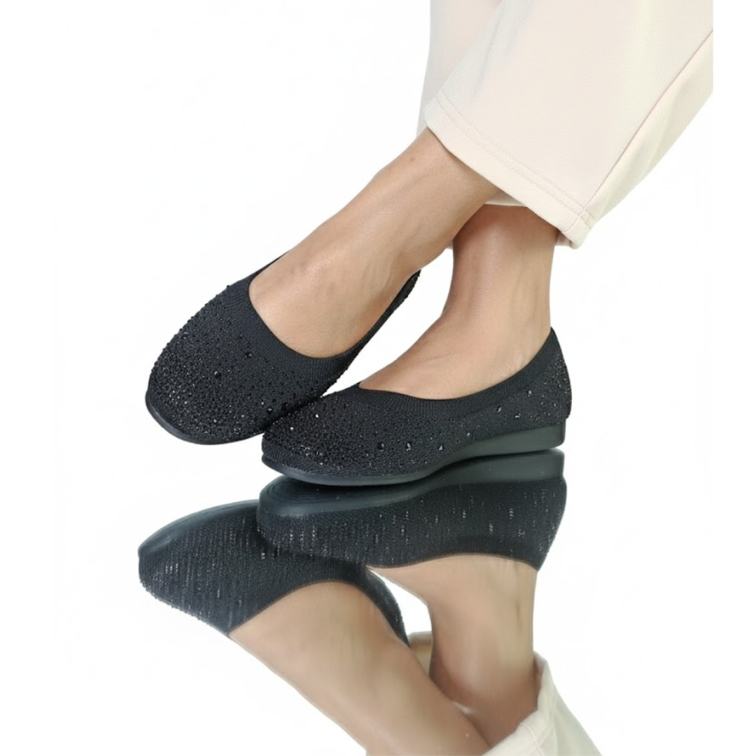 Delicate crystal embellishments scattered across the surface add a subtle shimmer, beautifully contrasting against the deep black tone. The rounded toe design ensures ease and comfort, while the lightweight, flexible sole supports smooth movement throughout the day.
