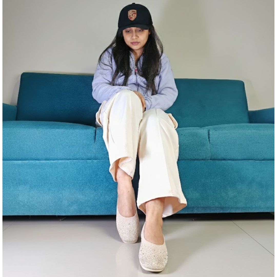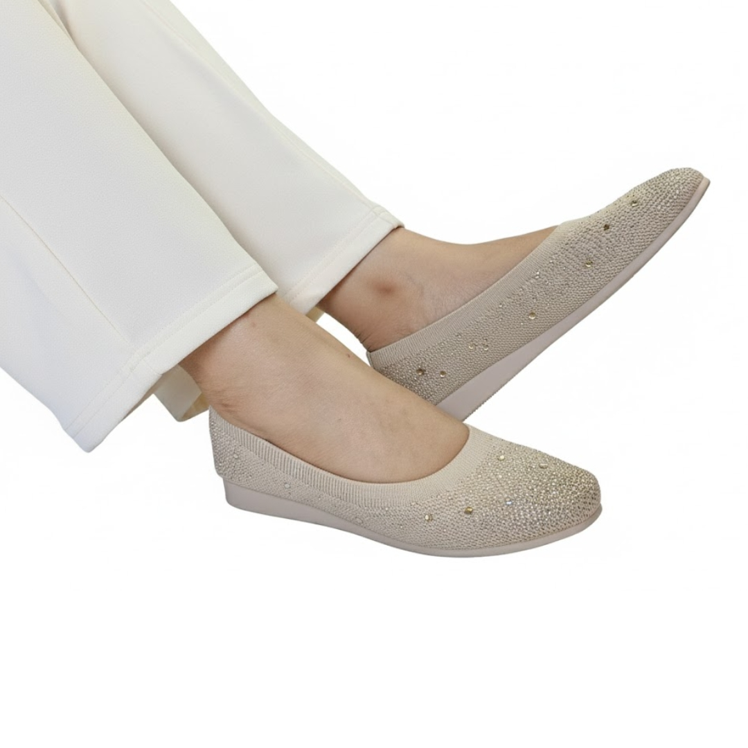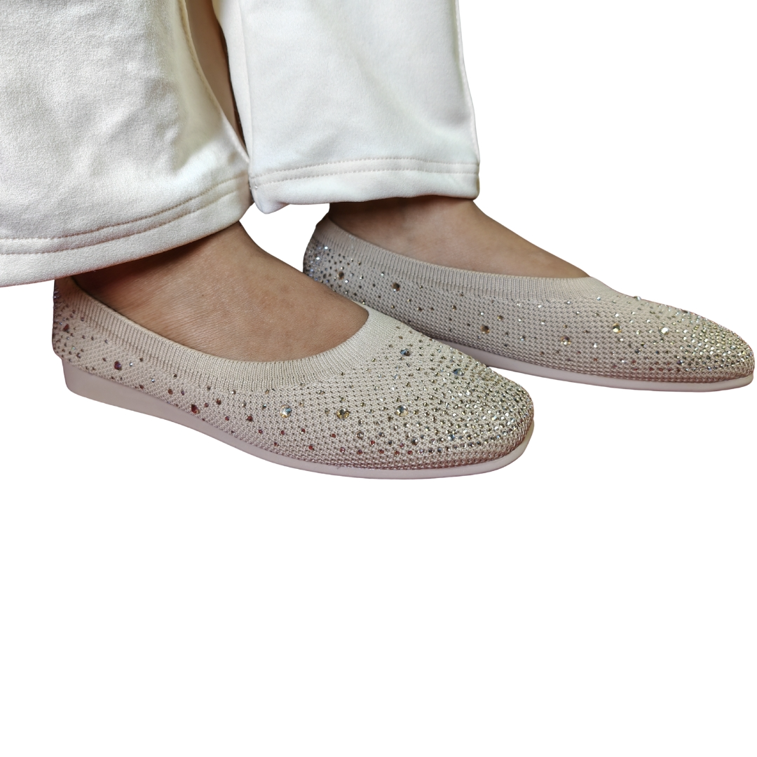 Delicately placed crystal embellishments add a subtle sparkle, making the shoe effortlessly elegant without feeling heavy or overdone. The rounded toe design ensures comfort, while the lightweight, flexible sole supports smooth movement throughout the day.
