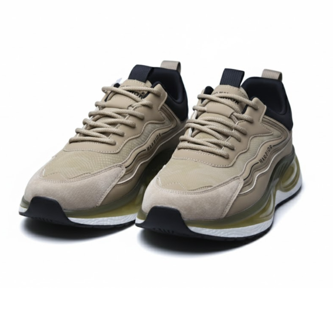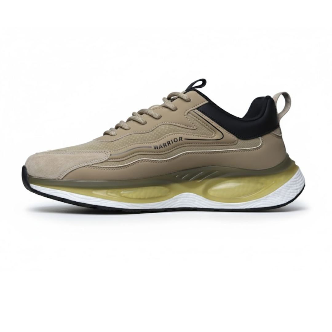 Step into modern style with the Warrior Khaki & Black Sneakers, designed to stand out with a unique mix of tones and textures. The upper combines a soft khaki/beige body with bold black accents on the heel and tongue, creating a balanced yet striking contrast. The sole features a translucent yellowish-gold layer over a clean white base, adding a touch of sophistication and trend-forward appeal. Built for comfort and durability, these Warrior sneakers are perfect for everyday wear, offering both versatility and premium design.