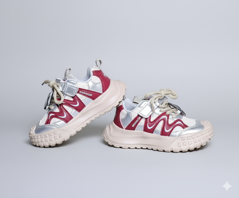 Give your kids the perfect mix of style, comfort, and durability with the Warrior Kids’ Sneakers. Designed with a bold red and silver colorway, these sneakers feature breathable mesh, strong synthetic overlays, and a chunky sole for extra grip. The lace-up and Velcro strap combination ensures a secure and easy fit, making them ideal for school, playtime, and everyday adventures.