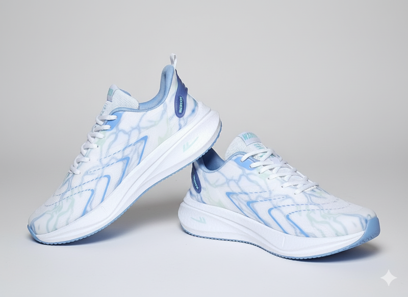 Make a splash with our WaveRunner Performance Sneakers. Featuring a unique, eye-catching design, these shoes are as stylish as they are functional. The light blue and white color scheme with a dynamic wave pattern gives a fresh, energetic look. The shoes are built with a lightweight, breathable mesh upper for a snug fit, and a cushioned sole that provides exceptional comfort and support for all your activities. Whether you're on a run or just out and about, the WaveRunner sneakers are the perfect blend of fashion and function.