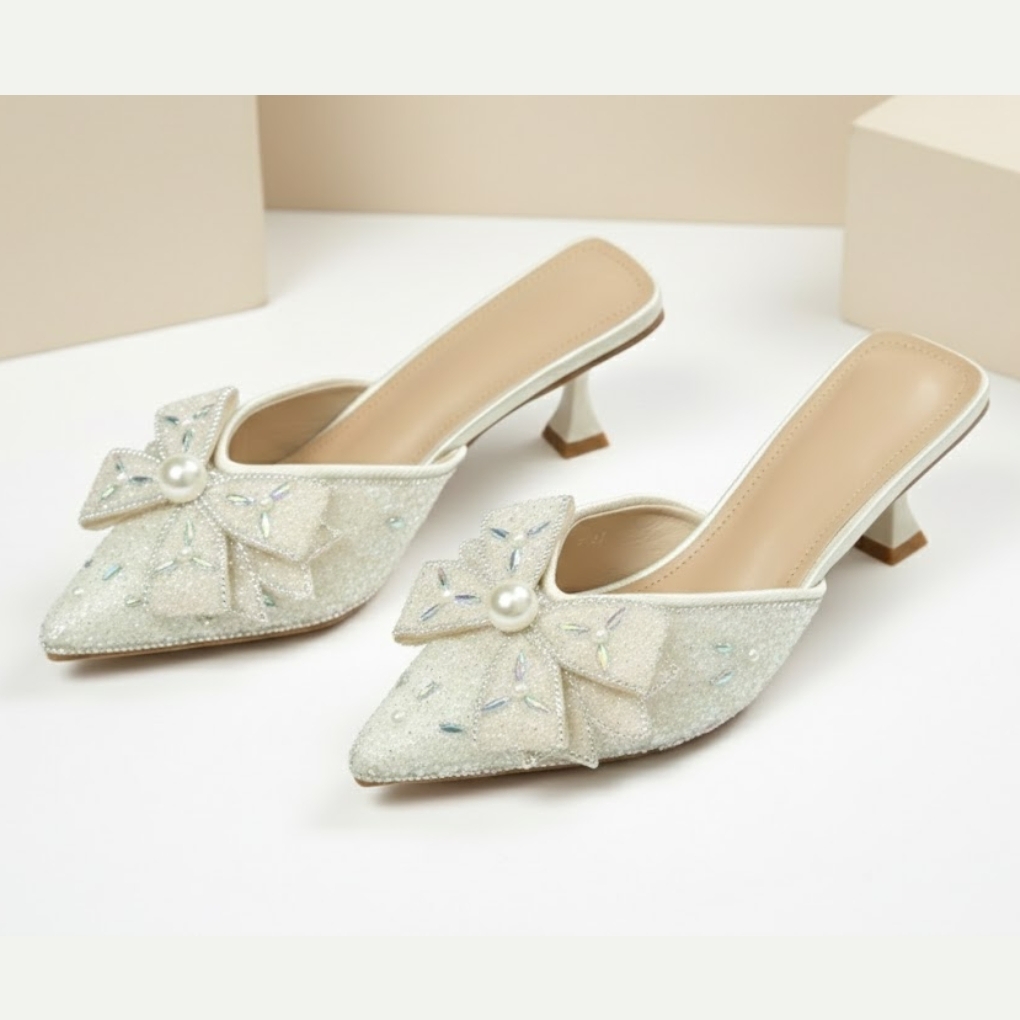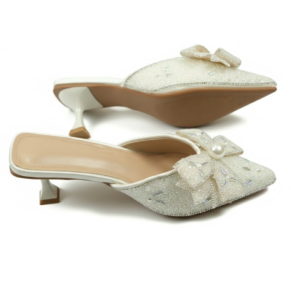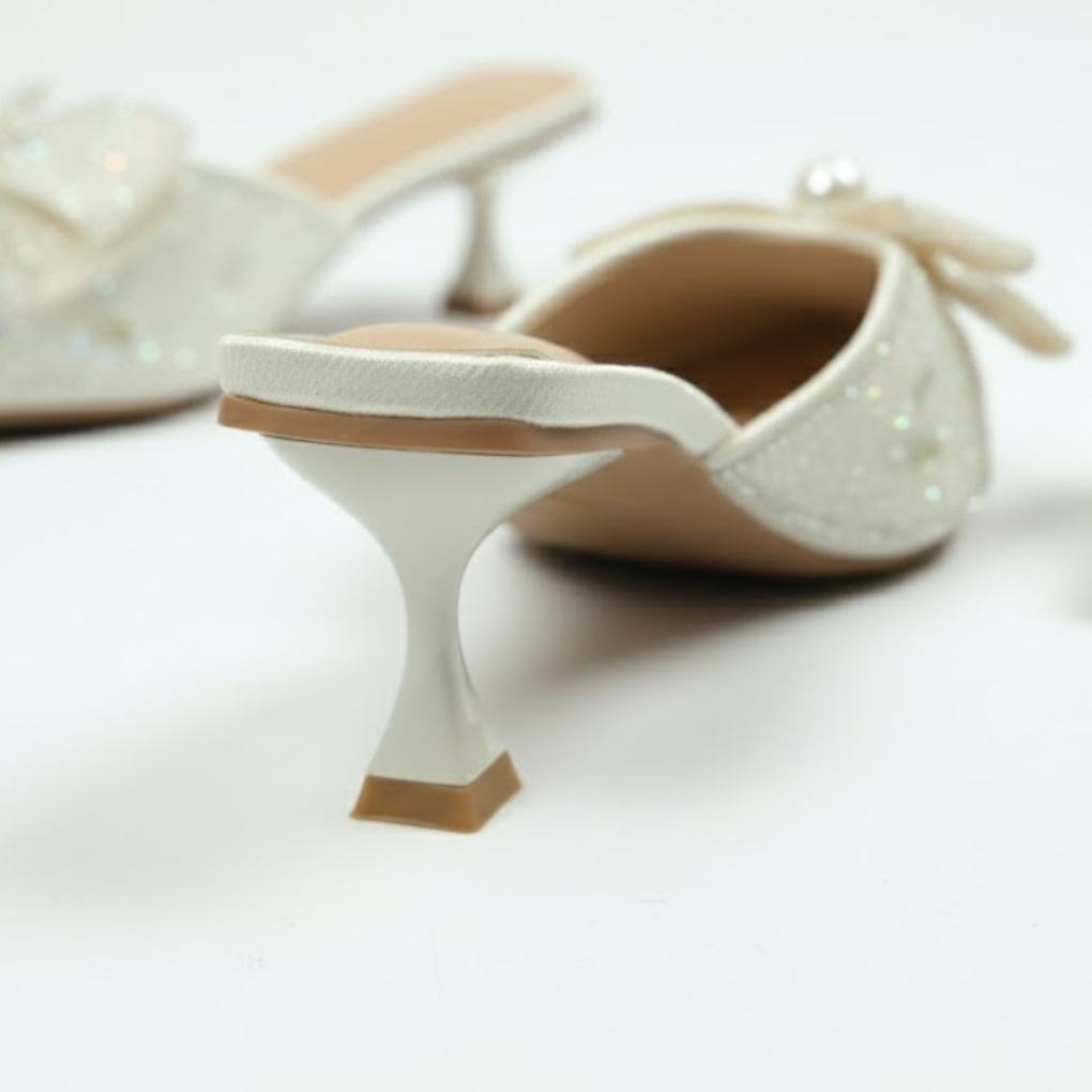 These white pointed-toe mule heels feature a delicate pearl-centered bow and a subtle shimmering finish for a graceful luxury look. The 2.25-inch flared kitten heel offers comfortable elevation, while the cushioned insole ensures all-day ease.